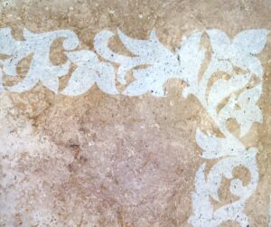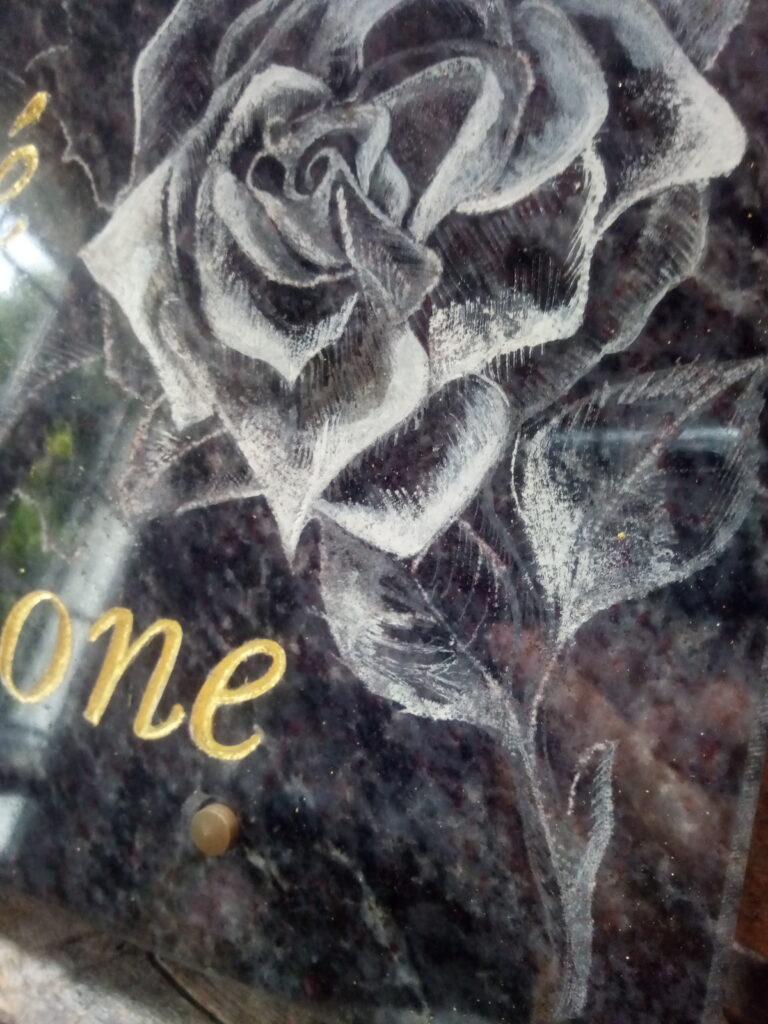 Sablage et feuille d’argent Feuille d’argent vieillie Motif par sablage Choix de dorures selon la pierre Médaillons photo Initiales dorées à l’or fin Gravure avec peinture blanche